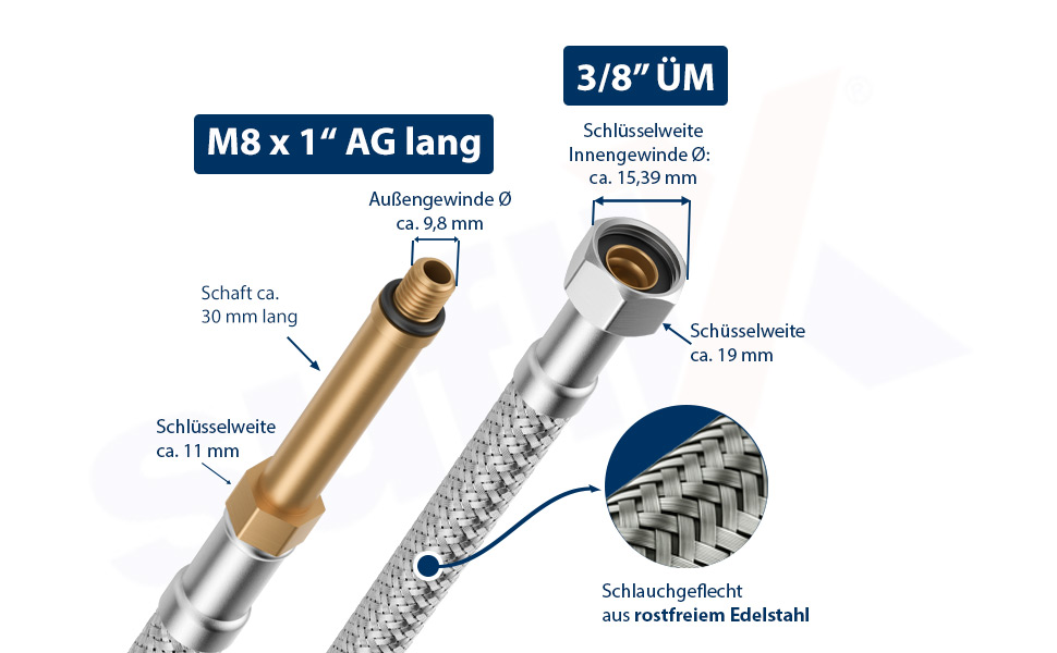 - Anschlüsse: 3/8" ÜM x M8 x 1 AG lang