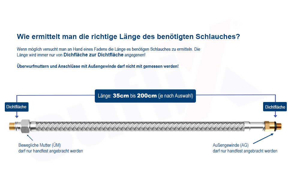 Die Länge des Edelstahl Flexschlauch DN8 ist von Dichtfläche bis Dichtfläche bemessen.