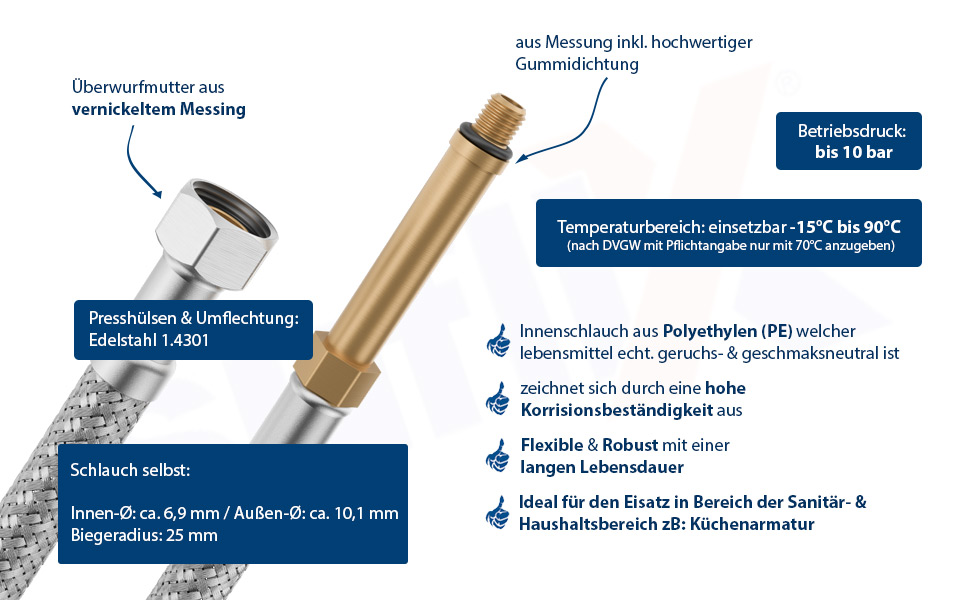 Unser Schlauch wird einbaufertig inklusive einer Dichtung für die Überwurfmutter geliefert!